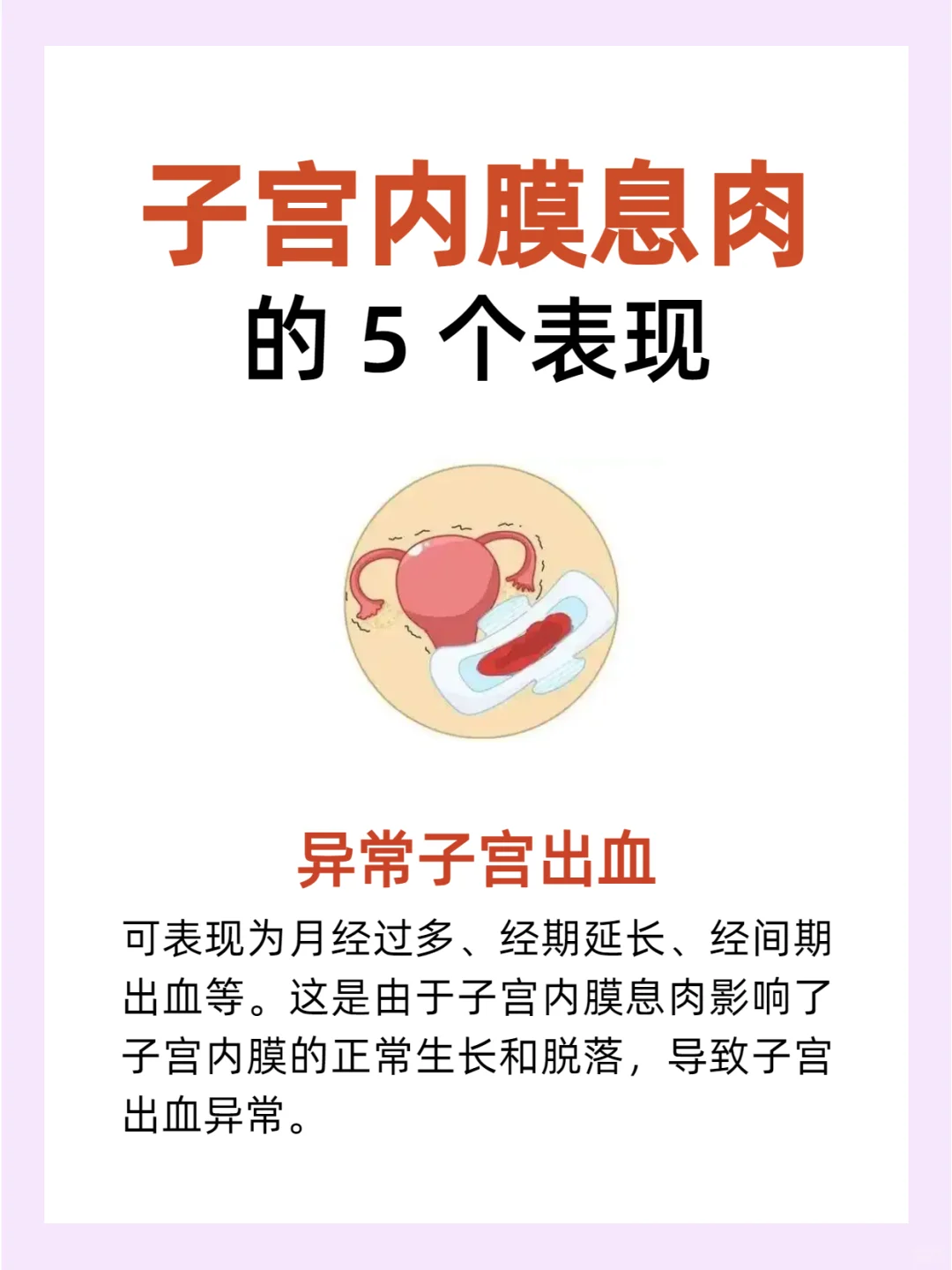 可表现为月经过多、经期延长、经间期出血等。这是由于子宫内膜息肉影响了子宫内膜的正常生长和脱落,导致子宫出血异常。