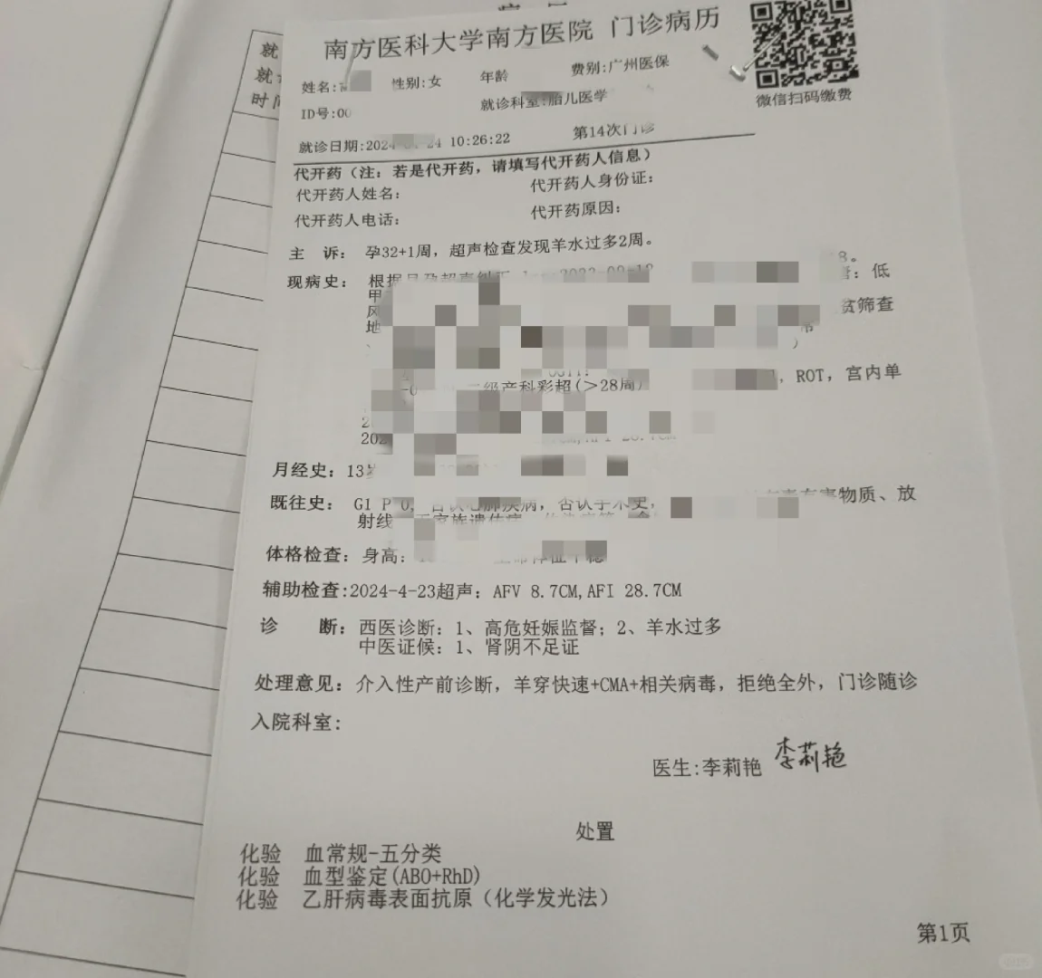 病史:从30周小排畸查出羊水过多,后面连续两周羊水指数一次比一次高,羊水最大深度8.7cm,羊水指数26.7cm
